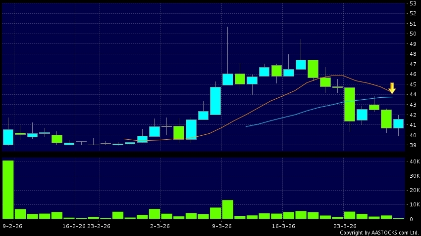 MUYUAN(02714.HK)  +0.840 (+2.066%)   's SMA 10 crosses below SMA 20, which is a death cross. Last printed at 41.500; rose 2.066%; on volume of 692.80K shares and turnover of $28.66M