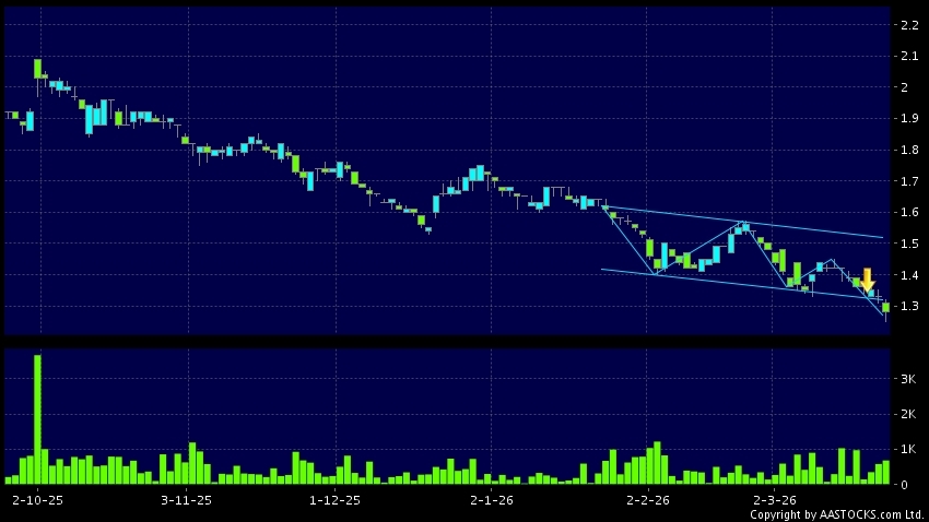 C-MER MEDICAL(03309.HK)  +0.020 (+1.600%)   appears a downside range breakout. Last printed at 1.280; fell 3.759%; on volume of 686.00K shares and turnover of $874.08K