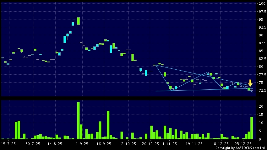 三角形向下突破是指股价的波幅渐渐收窄,在图表上形成三角形般的状态。股价在三角形的末端向下突破,下跌趋势形成,技术走势偏软。(港股报价延迟最少十五分钟。)