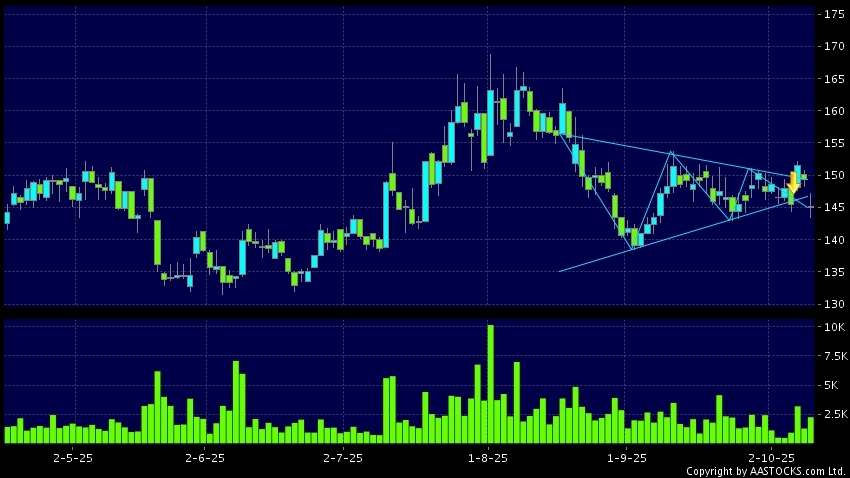 三角形向下突破是指股价的波幅渐渐收窄,在图表上形成三角形般的状态。股价在三角形的末端向下突破,下跌趋势形成,技术走势偏软。(港股报价延迟最少十五分钟。沽空资料截至 2025-10-13 16:25。)
