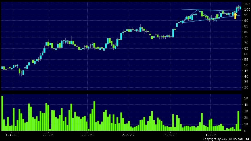 三角形向上突破是指股价的波幅渐渐收窄,在图表上形成三角形般的状态。股价在三角形的末端向上突破,形成上升趋势,技术走势向好。(港股报价延迟最少十五分钟。沽空资料截至 2025-10-13 16:25。)