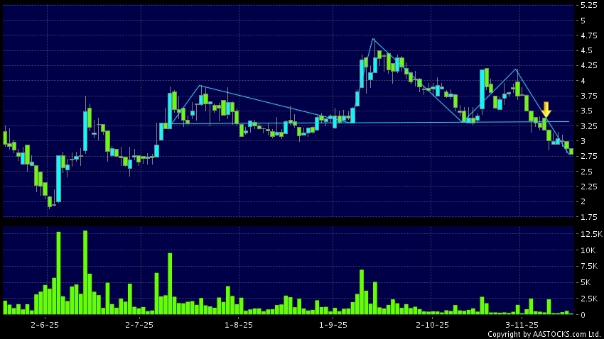 君圣泰医药-B(02511.HK) -0.130 (-4.643%) 沽空 $10.04万; 比率 7.272% 呈现头肩顶向下突破。现价报2.790,下跌3.125%,成交量17.30万股,成交额48.97万。