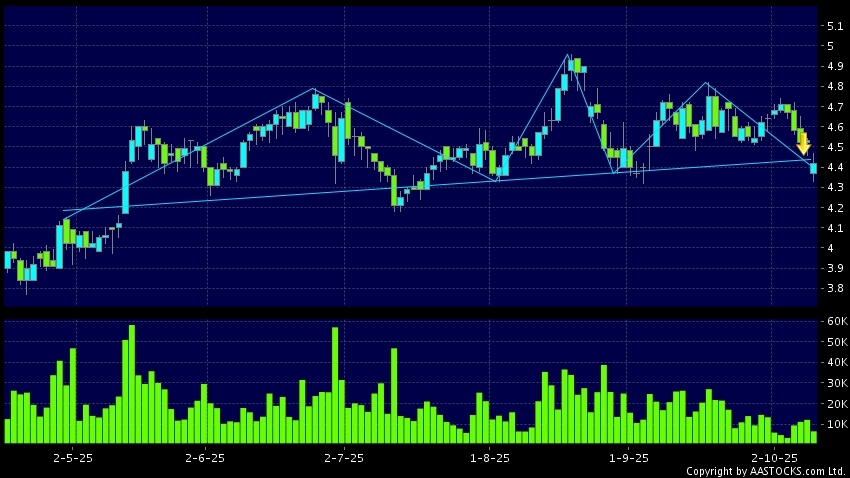 波司登(03998.HK) -0.010 (-0.221%) 沽空 $2.28千万; 比率 17.635% 呈现头肩顶向下突破。现价报4.430,下跌2.208%,成交量7.50百万股,成交额3.30千万。