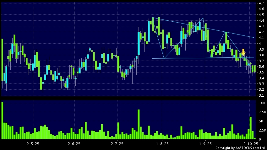 三角形向下突破是指股价的波幅渐渐收窄,在图表上形成三角形般的状态。股价在三角形的末端向下突破,下跌趋势形成,技术走势偏软。(港股报价延迟最少十五分钟。)