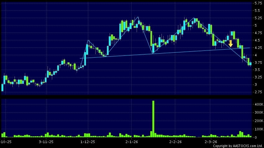头肩顶是典型的沽出讯号,当股价跌穿支持线(颈线)时,跌势确认股价将持续下跌,技术走势偏软。(港股报价延迟最少十五分钟。沽空资料截至 2026-03-27 16:25。)