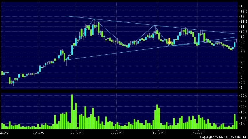三角形向下突破是指股价的波幅渐渐收窄,在图表上形成三角形般的状态。股价在三角形的末端向下突破,下跌趋势形成,技术走势偏软。(港股报价延迟最少十五分钟。沽空资料截至 2025-10-13 16:25。)