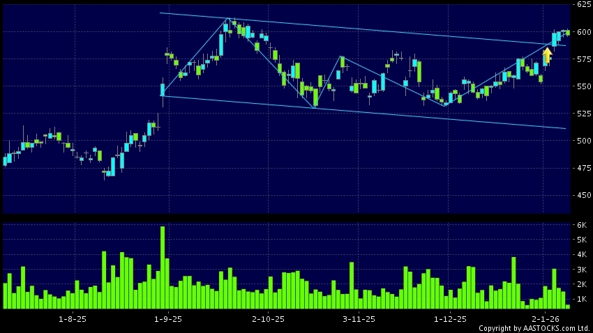 区域突破指股价在过去的一段时间只在一个范围在内活动,然後股价上升作出突破,升穿区域的顶部,技术走势向好。(港股报价延迟最少十五分钟。沽空资料截至 2026-01-09 16:25。)