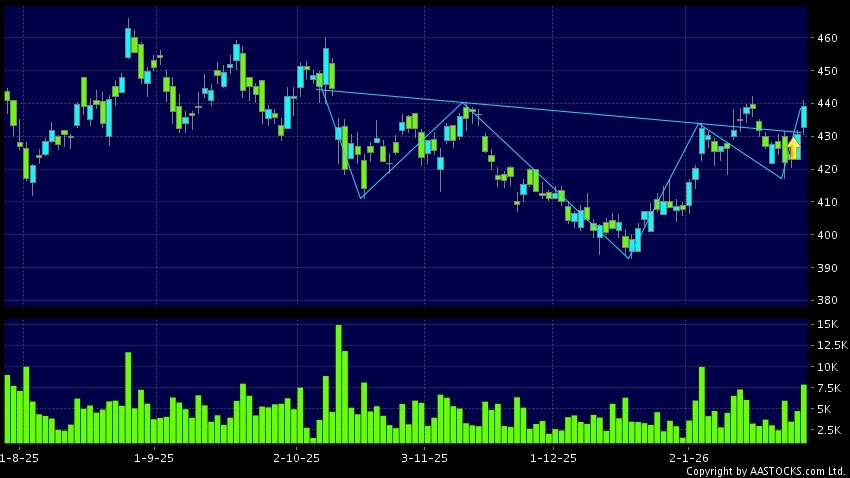 香港交易所(00388.HK)呈現頭肩底向上突破,股價升穿頸線。现价报439.200,上升2.045%,成交量7.85百万股,成交额34.29亿。最近表现:3日 +4.076%5日 +2.761%10...