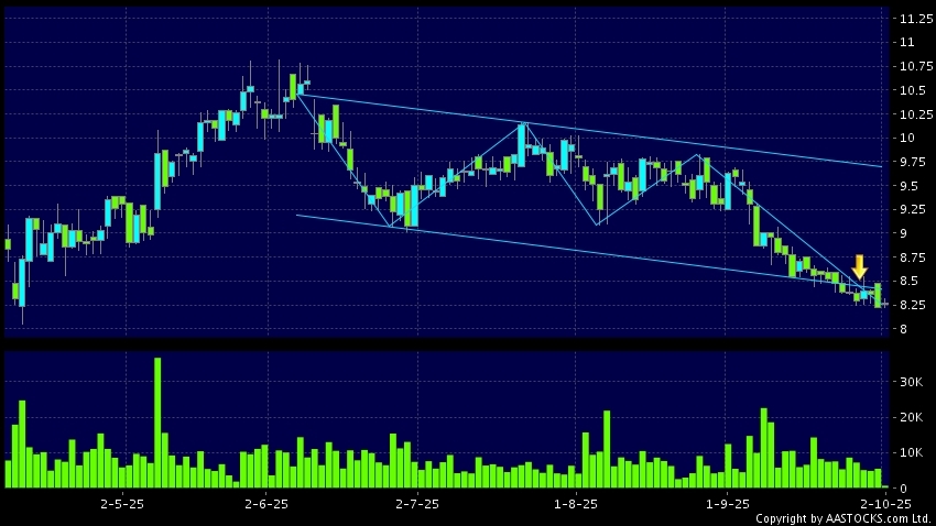 統一企業中國(00220.HK) 0.000 (0.000%) 沽空 $2.07百萬; 比率 15.696% 呈現區域下軌突破。現價報8.310,上升1.095%,成交量87.10萬股,成交額7.19百萬。