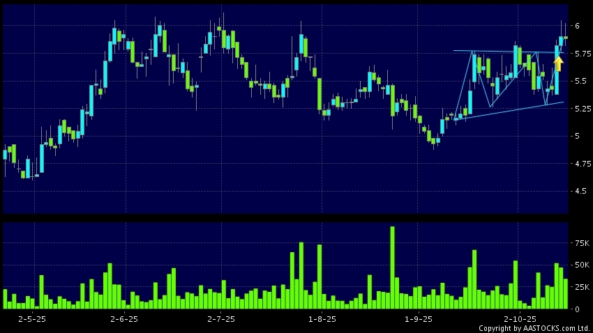 三角形向上突破是指股價的波幅漸漸收窄,在圖表上形成三角形般的狀態。股價在三角形的末端向上突破,形成上升趨勢,技術走勢向好。(港股報價延遲最少十五分鐘。沽空資料截至 2025-10-20 16:25。)