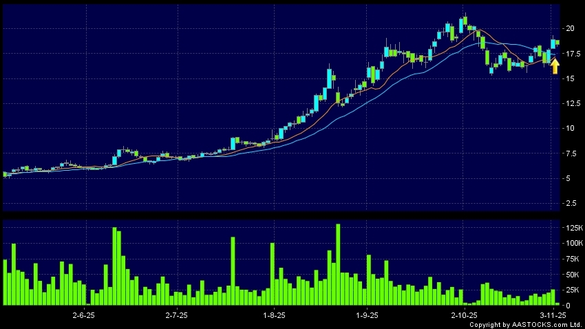 匯量科技(01860.HK) -0.050 (-0.277%) 10天移動平均線升穿20天移動平均線,出現黃金交叉。現價報18.440,下跌2.537%,成交量4.65百萬股,成交額8.59千萬。