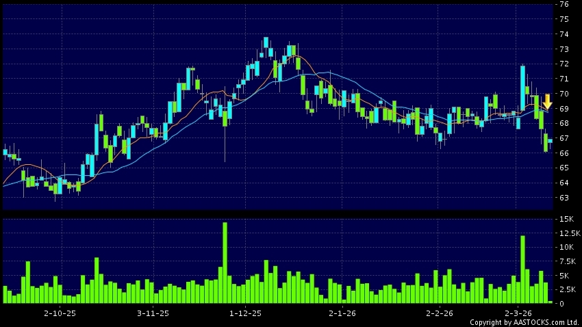 新奧能源(02688.HK) +0.700 (+1.059%) 沽空 $8.76百萬; 比率 20.075% 10天移動平均線跌穿20天移動平均線,出現死亡交叉。現價報67.050,上升1.437%,成交量44.79萬股,成交額2.99千萬。