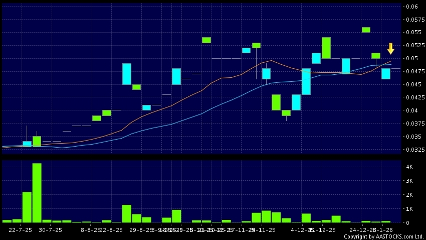 新威工程集團(08616.HK)  +0.007 (+13.725%)   10天移動平均線跌穿20天移動平均線,出現死亡交叉。現價報0.048,無升跌,成交量0.00股,成交額0.00。
