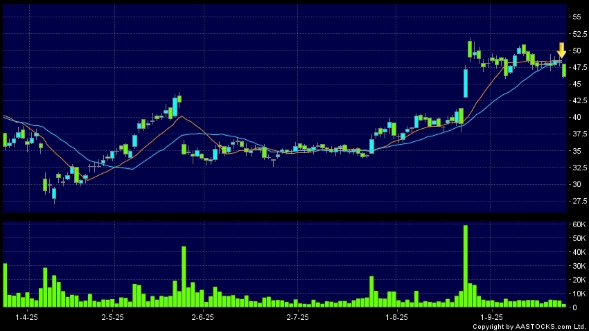 名創優品(09896.HK) -0.360 (-0.844%) 沽空 $9.28千萬; 比率 47.954% 10天移動平均線跌穿20天移動平均線,出現死亡交叉。現價報46.120,下跌4.355%,成交量2.50百萬股,成交額1.16億。