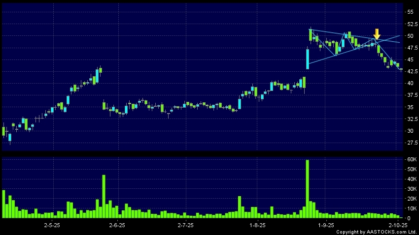三角形向下突破是指股價的波幅漸漸收窄,在圖表上形成三角形般的狀態。股價在三角形的末端向下突破,下跌趨勢形成,技術走勢偏軟。(港股報價延遲最少十五分鐘。沽空資料截至 2025-10-08 16:25。)