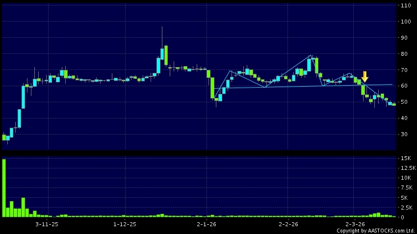 XUANZHUBIO-B(02575.HK)  0.000 (0.000%)   appears a downside breakout, dropped below the neckline. Last printed at 47.960; fell 4.080%; on volume of 251.50K shares and turnover of $12.15M