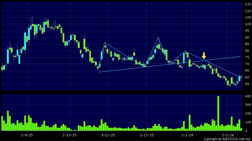 INNOSCIENCE(02577.HK) appears a downside breakout, dropped below the neckline. Last printed at 59.650; fell 1.649%; on volume of 3.10M shares and turnover of $184.71MRecent Perform...