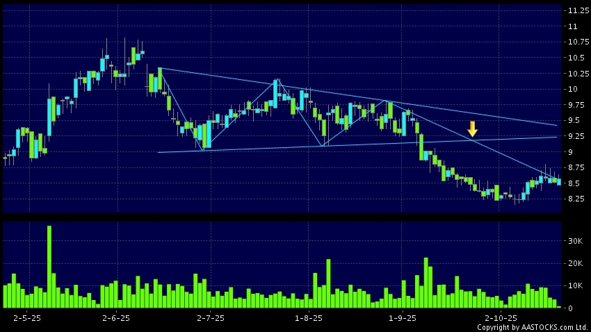 三角形向下突破是指股价的波幅渐渐收窄,在图表上形成三角形般的状态。股价在三角形的末端向下突破,下跌趋势形成,技术走势偏软。(港股报价延迟最少十五分钟。沽空资料截至 2025-11-06 16:25。)