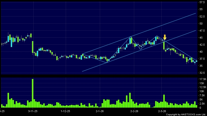 区域突破指股价在过去的一段时间只在一个范围在内活动,然後股价下跌作出突破,跌穿区域的底部,技术走势偏软。(港股报价延迟最少十五分钟。沽空资料截至 2026-03-31 16:25。)