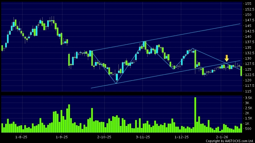 區域突破指股價在過去的一段時間只在一個範圍在內活動,然後股價下跌作出突破,跌穿區域的底部,技術走勢偏軟。(港股報價延遲最少十五分鐘。沽空資料截至 2026-01-16 16:25。)