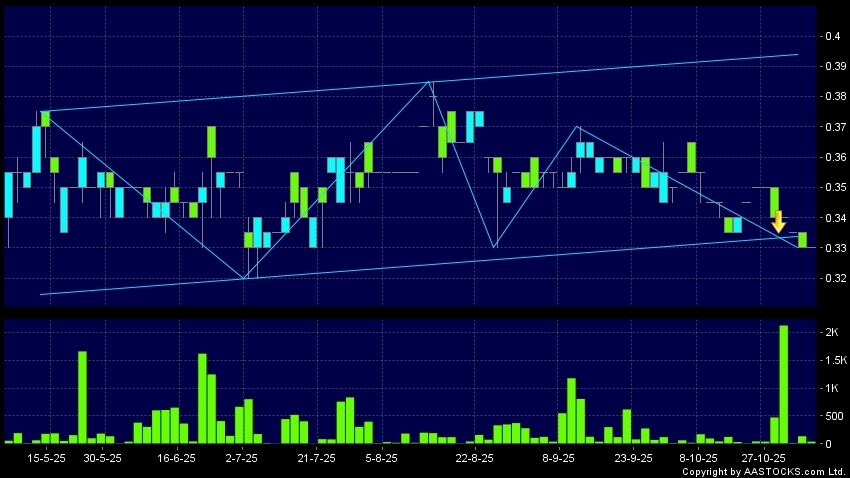 莊士機構國際(00367.HK) +0.010 (+3.226%) 呈現區域下軌突破。現價報0.330,無升跌,成交量4.00萬股,成交額1.30萬。