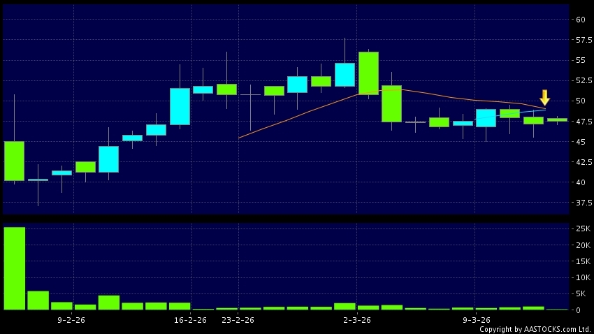 國恩科技(02768.HK) +2.740 (+5.808%) 10天移動平均線跌穿20天移動平均線,出現死亡交叉。現價報47.720,上升1.145%,成交量24.68萬股,成交額1.18千萬。