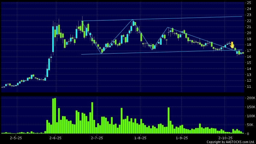 區域突破指股價在過去的一段時間只在一個範圍在內活動,然後股價下跌作出突破,跌穿區域的底部,技術走勢偏軟。(港股報價延遲最少十五分鐘。沽空資料截至 2025-10-17 16:25。)
