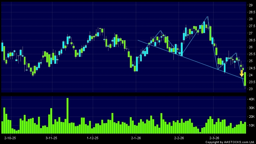 頭肩頂是典型的沽出訊號,當股價跌穿支持線(頸線)時,跌勢確認股價將持續下跌,技術走勢偏軟。(港股報價延遲最少十五分鐘。沽空資料截至 2026-03-23 16:25。)
