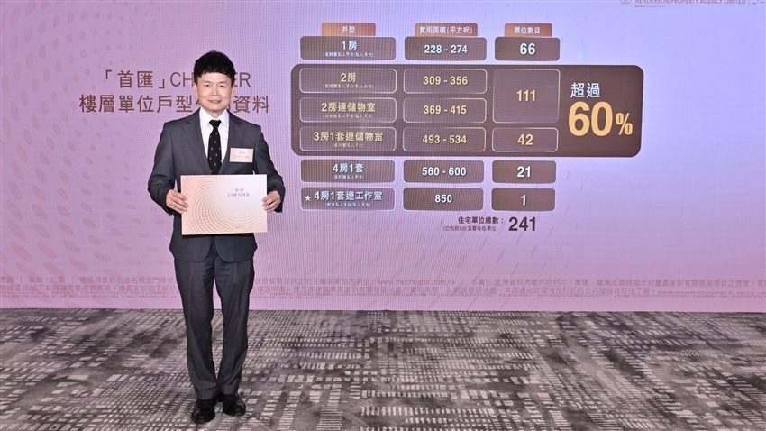 項目主打中型至大型單位,兩房及三房戶型佔全盤逾六成,其中兩房佔107伙、三房一套佔42伙,另有一房佔63伙,並設有21伙四房一套大宅。另外,項目提供少量特色單位,佔8伙,當中包括全盤僅此一戶的四房一套連工作室、外設雙空中私人平台及私人天台的頂層天際特色戶。